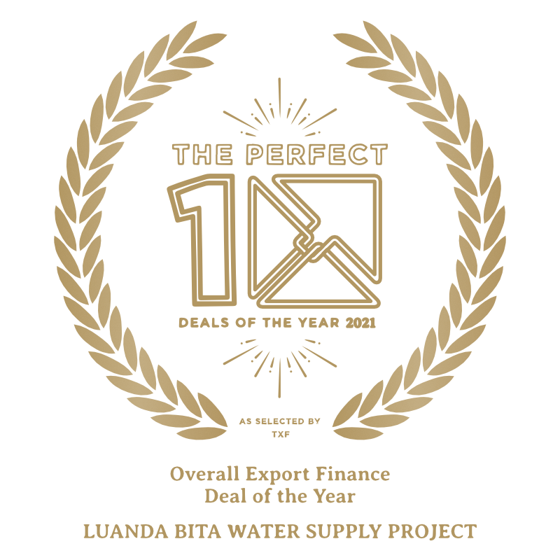 Prix de la meilleure transaction Export Finance toute catégorie 2021. Financement d’un projet en Angola pour développer et améliorer les infrastructures d’eau pour lequel Crédit Agricole CIB est intervenu en tant que chef de file dans le prêt garanti de 910 millions de dollars US avec la Banque internationale pour la reconstruction et le développement (BIRD). Cette transaction est également lauréate de prix décernés par The Banker, Bonds & Loans Africa Awards et GTR en 2022.